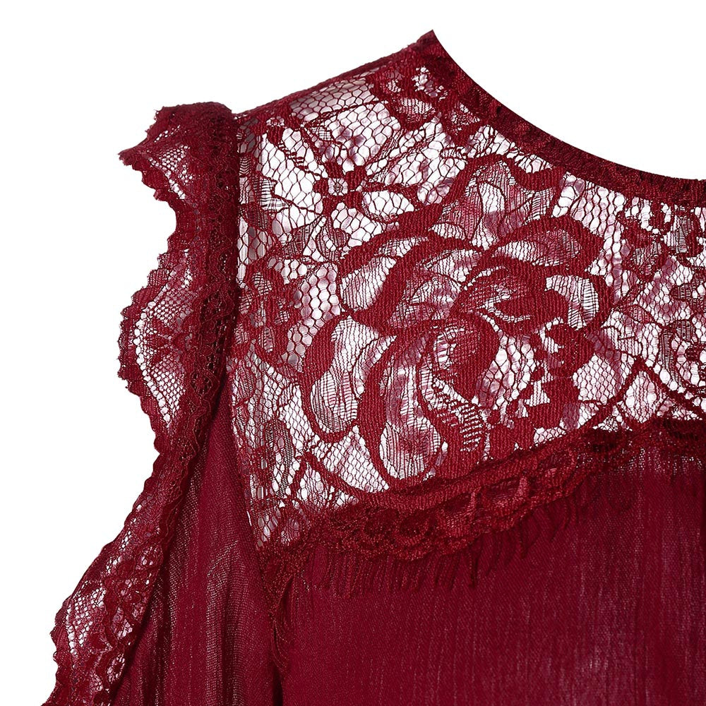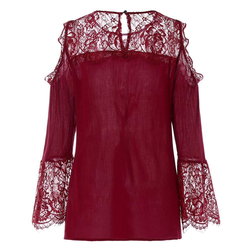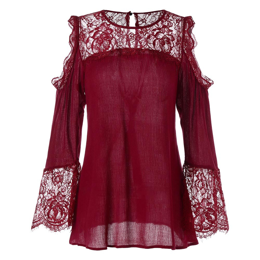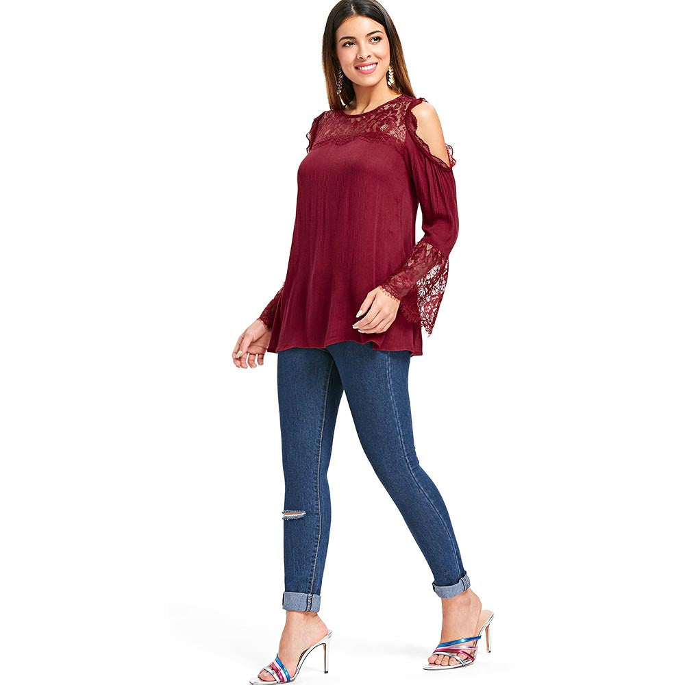 Beautiful, sexy and feminine, this blouse in luxurious soft material features sexy cold shoulders, sweet lace insert and long sleeves with bell-shaped cuffs. Casual round neck with buttons closure at the back for added appeal. It is an easy essential perfect for everyday wear.