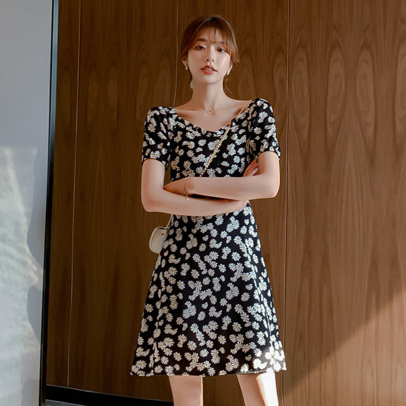 【DPS1688】L1446RX-2020一字肩小雏菊雪纺连衣裙韩版新款夏收腰显瘦气质碎花裙小个子裙子